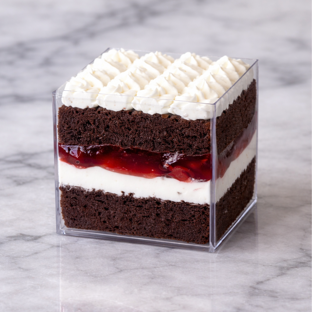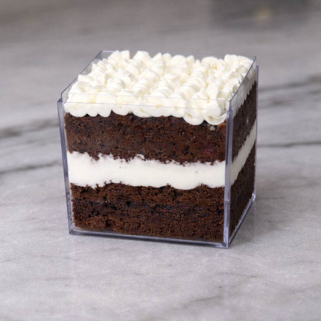 A moist dark chocolate cake lightly drizzled with rum syrup, layered with cherry filling, and finished with vanilla buttercream.