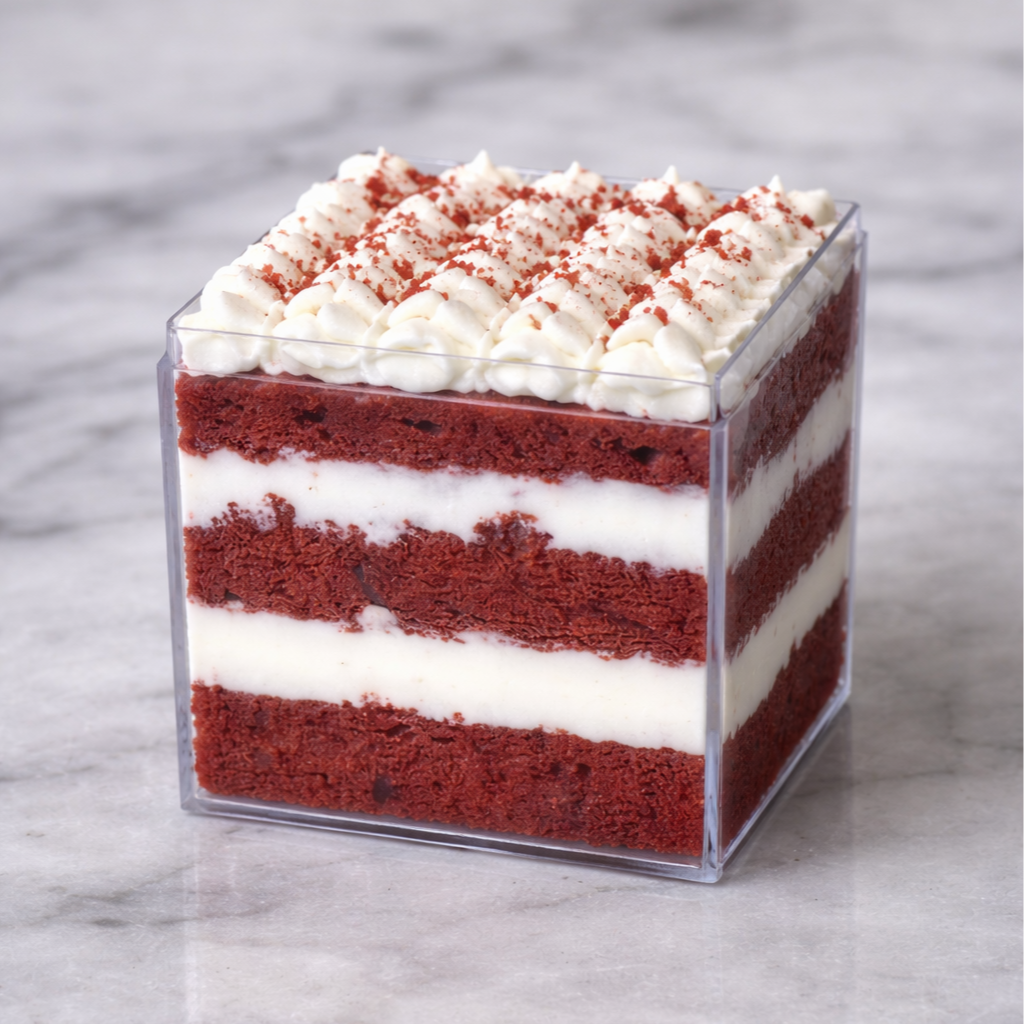 A moist red velvet cake finished with white chocolate ganache